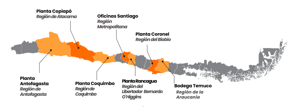 Nuestras sucursales se encuentran en las ciudades de Antofagasta, Copiapó, Coquimbo, Rancagua, Bodega Temuco y Coronel donde se encuentran disponibles nuestros productos.